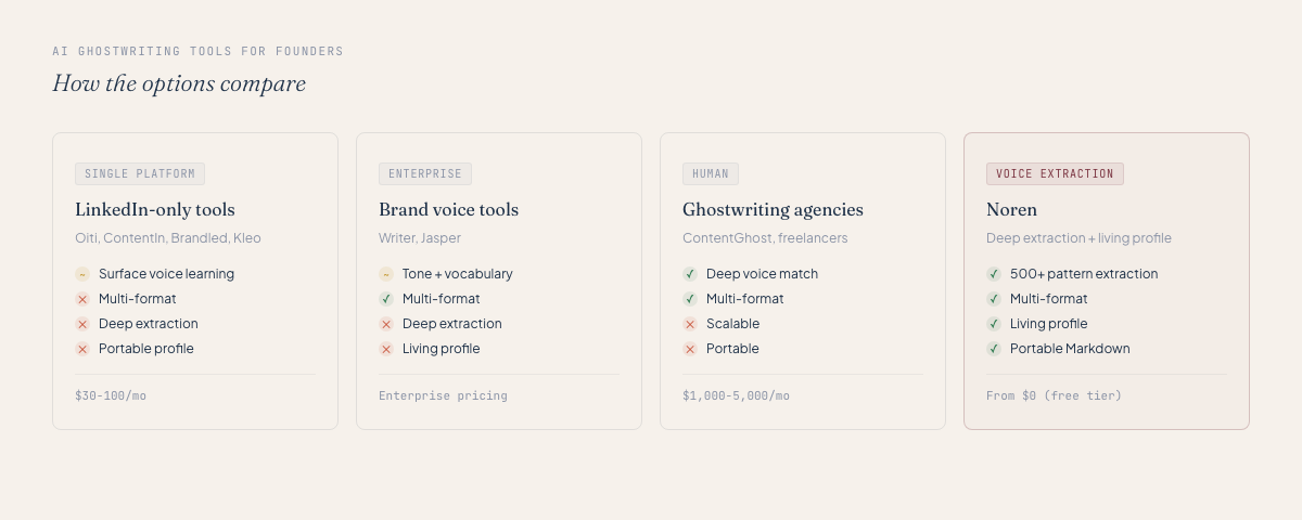 Human agencies (ContentGhost at $4,500/month) produce great results but don't scale. One ghostwriter, one client, months of calibration.