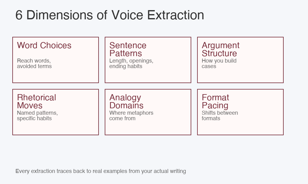 Rhetorical moves. Named patterns the engine identifies and labels. How you use analogies. How you transition between ideas. How you open and close pieces. These moves repeat across your writing, and they're specific enough to name: "opens with a counterintuitive claim," "uses a concrete counting move to ground abstractions."