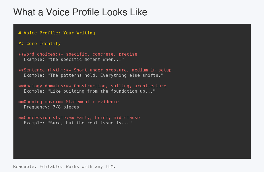 What comes out is a layered voice profile in Markdown: readable, portable, editable, and entirely yours to edit or change.