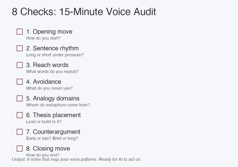 This exercise takes 15 minutes and closes that gap. By the end, you'll have a rough map of your own voice: the kind of map that tells AI what to actually replicate, not just what tone to aim for.